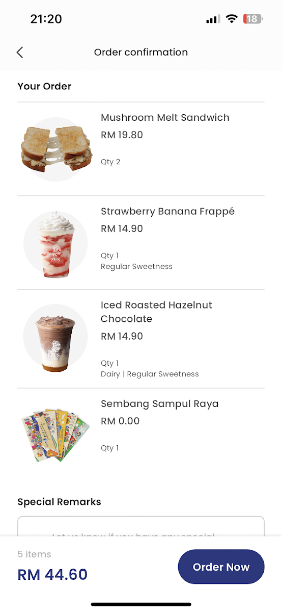 The menu features an enticing selection of beverages that elevate your coffee experience. For those who adore a twist on classic flavors, try the Strawberry Americano, a fruity upgrade that awakens your taste buds with its tangy strawberry infusion (MYR 9.90) or the Orange Americano, where bright citrus meets bold espresso to give your morning a zestful kick. If you're a fan of chocolate, the Hot Roasted Hazelnut Chocolate (MYR 15.90) is a nutty delight that hits the right spots, mirroring the rave reviews from satisfied guests.